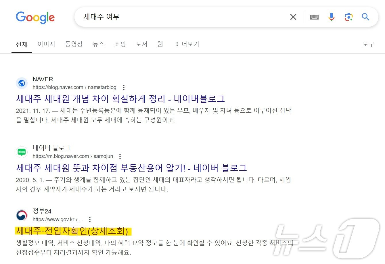 16일 구글에서 ‘세대주여부’를 검색했을 때 정부24의 ‘세대주·전입자확인’을 클릭하면 A씨의 전입신고서가 떴다.