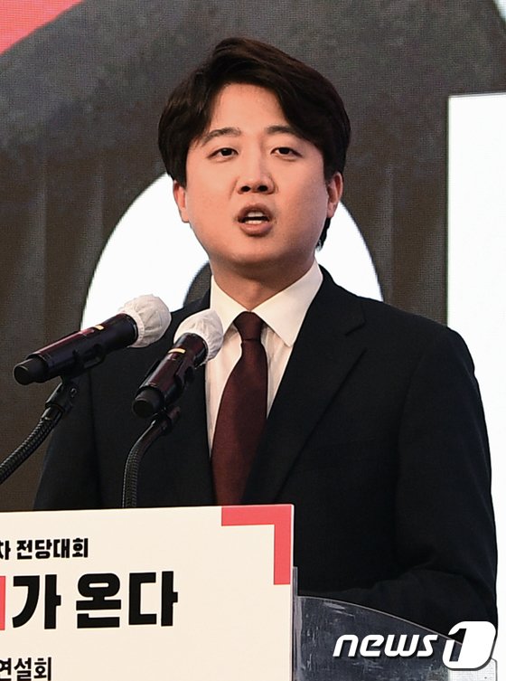 2021년 6월 3일 대구시 북구 엑스코에서 열린 '2021 국민의힘 1차 전당대회 대구·경북 합동연설회에서 당시 이준석 국민의힘 당대표 후보가 지지를 호소하고 있다. 이날 이 후보는 "우리는 탄핵 이후 길고 어두운 터널 끝에 값진 승리를 얻었다. 과거로 돌아 갈 수 없다"며 탄핵의 강을 건너자고 외쳤다. © News1 남승렬 기자