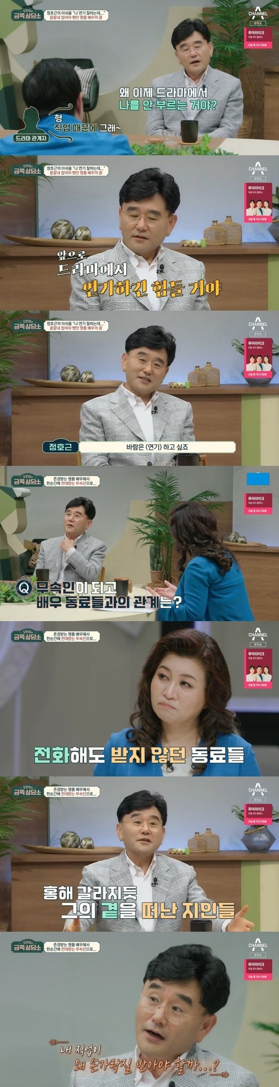 지난 15일 방송된 채널A 예능 프로그램 ‘오은영의 금쪽 상담소’에는 30년간 배우로 활동하다 신내림을 받아 무속인이 된 정호근이 등장했다. 이 자리에서 그는 직업 때문에 그간 드라마에 출연하지 못했다며 “연기를 다시 했으면 좋겠다”라는 바람을 전했다.