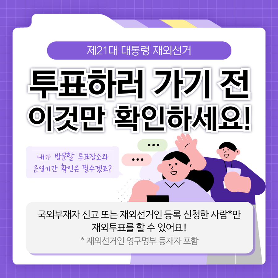 5.26. ~ 6. 3. 까지 귀국투표 신고를 하면 선거일(6.3.)에 국내 투표소에서 투표 가능합니다!