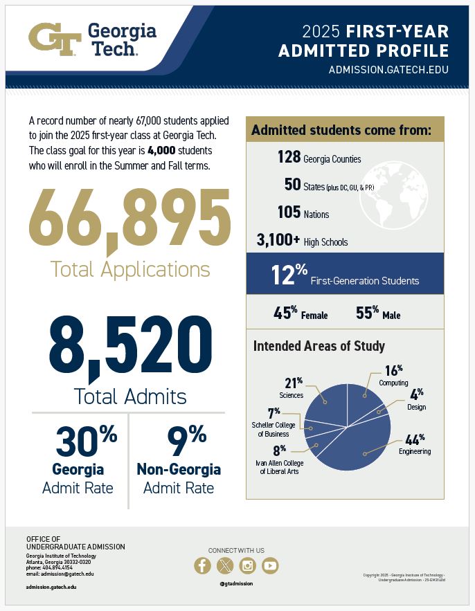 조지아텍이 발표한 자료에 따르면 2025 학년도 입학 지원자는 6만 6천 895명으로 기록됐으며 8천 5백20명이 최종 합격자 명단에 올랐다. 그 중 조지아 지원자 30%, 타주 지원자 9% 의 합격률을 나타냈다. 지원자는 지난해 대비 12%가 증가한 것으로 기록됐다. 또한 올 해 편입생은 약 5천 5백명정도이며 7천 6백명이 추가합격 대기자로 나타났다.