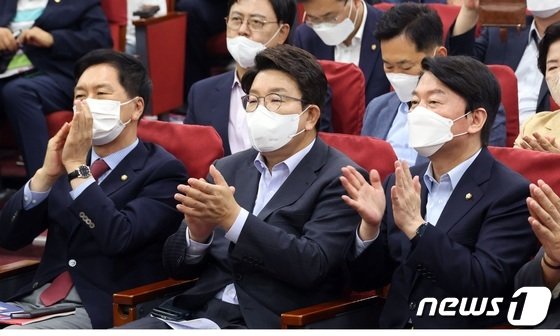 왼쪽부터 국민의힘 김기현 의원, 권성동 당대표 직무대행 겸 원내대표, 안철수 의원.© 뉴스1