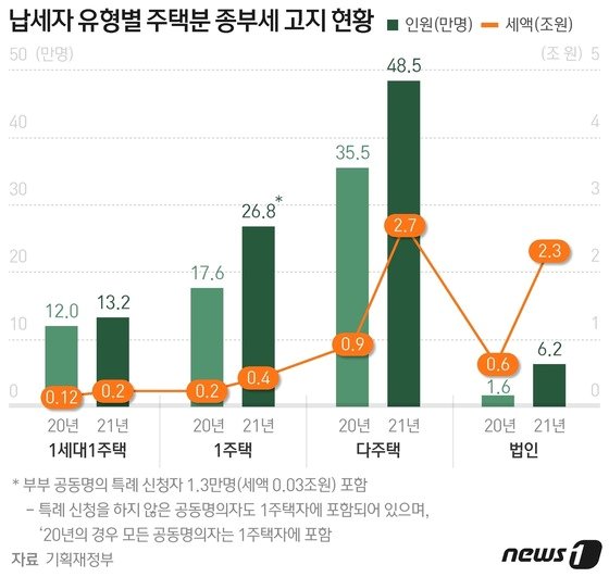 94만7000명이 총 5조7000억원을 부담하는 올해 종합부동산세(종부세) 고지서가 22일 고지되면서 부동산 커뮤니티가 들끓고 있다. 인원 기준으로는 전년 대비 두 배, 세액을 기준으로 하면 세 배 이상 폭증한 규모다. 정부는 ‘종부세 대상자가 전체의 2%에 불과하다’고 밝혔다.