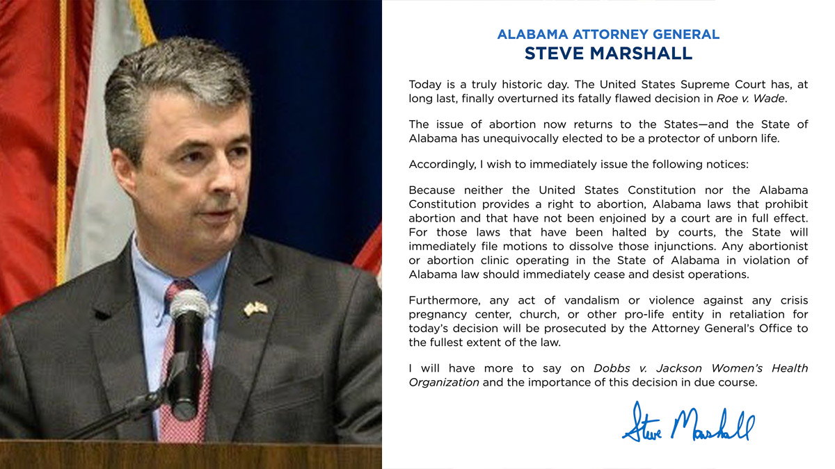 스티브 마셜(Steve Marshall) 앨라배마 주 법무장관은 연방대법원이 “로 대 웨이드” 판례를 뒤집는 판결을 내림에 따라 주법을 위반하려는 사람들에게 엄중 경고하고 나섰다.