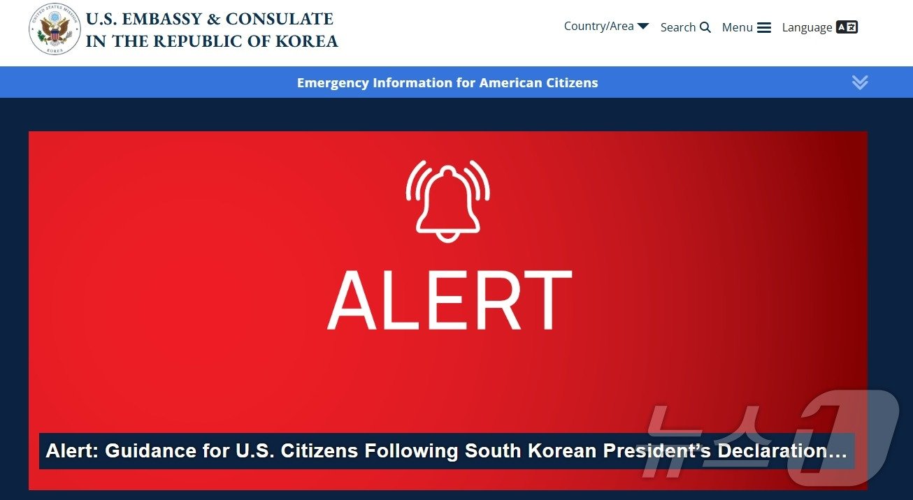 주한 미 대사관은 이날 영문 웹사이트 홈페이지에 적색 경보를 발령하고 ‘경보: 한국 대통령의 계엄령 선포에 따른 미국 국민을 위한 지침’ 안내문을 게재했다.