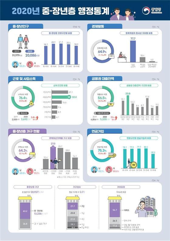 통계청이 21일 발표한 ‘2020년 중장년층 행정통계 결과’에 따르면 지난해 40~64세 중장년층 중 소득이 있는 이들의 개인 평균 소득은 3692만원으로 전년(3555만원) 대비 3.8% 증가했다.