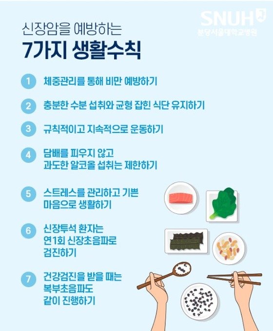 신장암은 특정 음식과 크게 연관성이 없다고 알려져 있지만, 비만과 그로 인해 발생하는 고혈압이 가장 큰 위험인자로 꼽힌다.