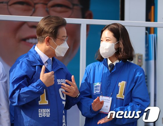 지난 19일 천 계양역 광장에서 열린 더불어민주당 인천 선거대책위원회 출정식에서 이재명 총괄선거대책위원장과 박지현 공동 비상대책위원장이 대화하고 있다. © News1 국회사진취재단