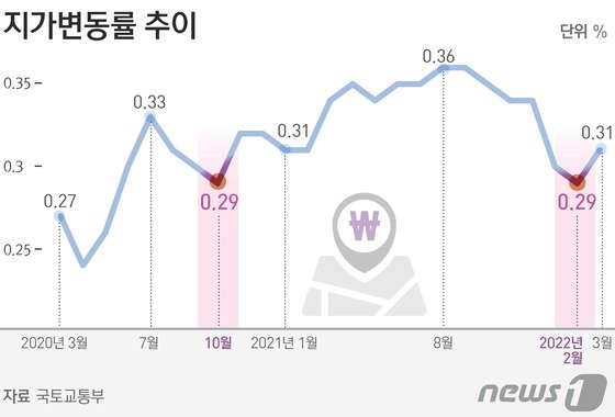 월별 땅값 상승률은 지난해 8월 0.36%를 기록한 뒤 10월 0.35%, 11월 0.34%를 기록하다 올해 1월 0.30%까지 둔화했다. 2월엔 0.29%까지 떨어졌다.