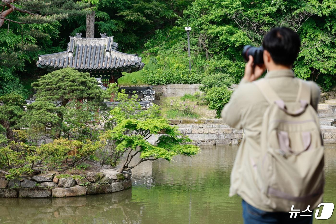 서울 중구 창덕궁에서 열린 2024 봄 궁중문화축전 '아침 궁을 깨우다' 프로그램에 참가한 시민들이 '궁궐 걷는 법' 저자 이시우 작가의 해설을 들으며 후원 부용지를 둘러보고 있다. 2024.4.29/뉴스1 ⓒ News1 안은나 기자