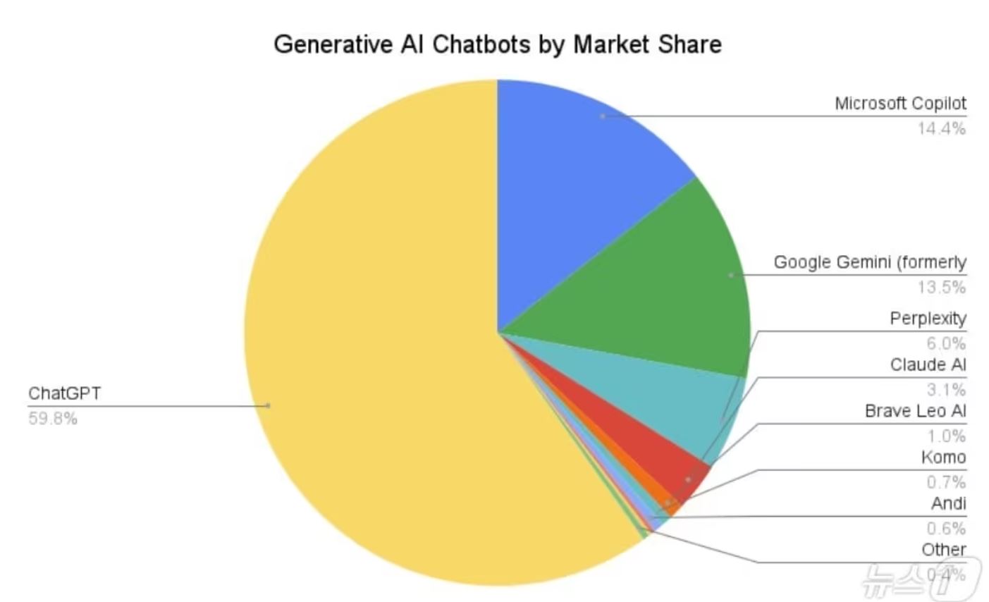 오픈AI가 초기 시장 진입자(2022년 11월 챗GPT 출시)로서 이점을 활용해 압도적인 점유율을 유지하고 있지만, 클로드·퍼플렉시티·코파일럿 등의 약진에 성장 속도가 완화한 것으로 분석됐다.