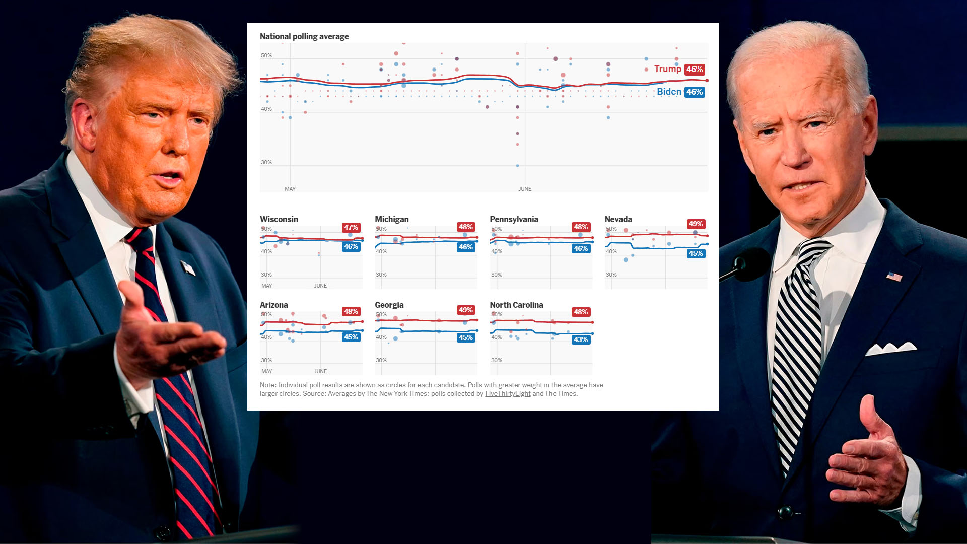 뉴욕타임스(NYT)가 25일(화) 종합 집계해 발표한 전국 여론조사 결과 평균값은 바이든과 트럼프가 각각 46% 동률을 보인 것으로 나타났다.