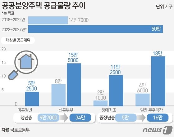 공공분양 공급물량 50만가구는 전 정부(총 14만7000가구) 대비 3배 이상 늘어난 수치로, 정부는 청년·서민들의 내 집 마련 기회가 크게 늘어날 것으로 보고 있다.