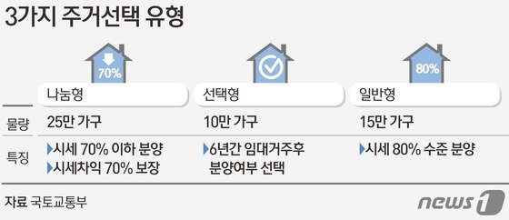 공공분양 주택 수요자는 소득·자산 여건, 생애주기 등에 맞게 △나눔형(25만가구) △선택형(10만가구) △일반형(15만가구) 등 3가지 모델 중 하나를 선택할 수 있다.