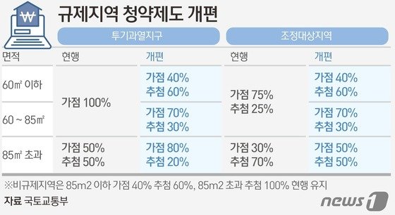 이에 투기과열지구에 1~2인 청년 가구 거주에 적합한 전용면적 60㎡ 이하 소형 평형 주택 구간을 신설하고, 전용 85㎡ 이하 중소형 평형에서 추첨제를 도입한다. 또 3~4인 중장년 가구 수요가 많은 85㎡ 초과는 가점제 물량을 확대하기로 했다.