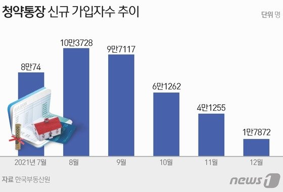 청약통장 가입자 증가 폭은 지난해 8월(10만3728명) 10만명 돌파 이후 △9월 9만7117명 △10월 6만1262명 △11월 4만1255명 △12월 1만7872명 등으로 4개월 연속 둔화했다. 지난해 12월과 8월을 비교하면, 12월 증가 폭은 8월의 17%에 그쳤다.