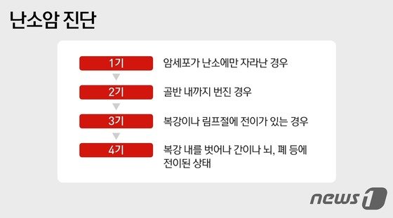 난소암은 진행 정도에 따라 1~4기로 나뉜다. 1기는 암세포가 난소에만 자라난 경우, 2기는 골반 내까지 번진 경우, 3기는 복강이나 림프절에 전이가 있는 경우이다. 4기는 복강 내를 벗어나 간이나 뇌, 폐 등에 전이된 상태를 말한다. 1기에 발견하면 치료 효과가 좋고 재발률도 낮지만 3기 이후에 발견하면 예후가 좋지 않다는 것이 전문가들의 주된 의견이다.