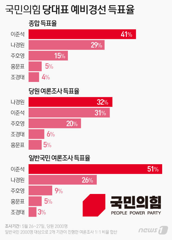 29일 국민의힘에 따르면 당 안팎에서는 전날(28일) 발표된 본경선 진출자 나경원·이준석·조경태·주호영·홍문표 후보(가나다순)의 승부를 섣불리 예측할 수 없다는 전망이 나온다.
