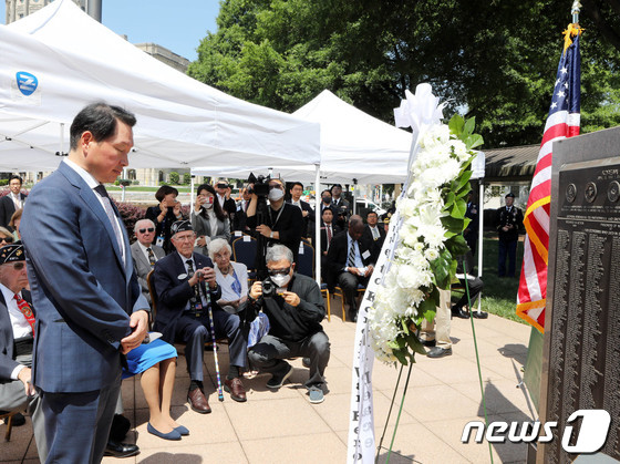 | 최태원 대한상의 회장이 24일(현지 시각) 오전 미국 조지아 주 애틀랜타 소재 한국전 참전용사 기념비 앞에서 열린 ‘한국전 영웅 추모식’에 참석, 한국전에서 전사한 미군의 희생을 기리는 헌화를 한 뒤 묵념하고 있다. © 뉴스1 |