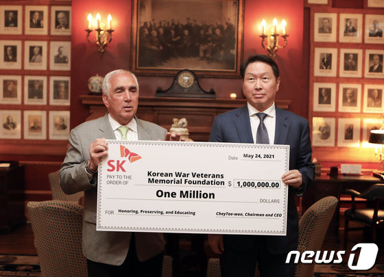 | 최태원 대한상의 회장(오른쪽)이 24일 오후(현지 시각) 미국 워싱턴 D.C. 메트로폴리탄클럽에서 ‘추모의 벽’ 건립기금 100만 달러를 존 틸럴리 한국전참전용사추모재단 이사장(전 주한미군사령관)에게 기부하고 있다.© 뉴스1 |