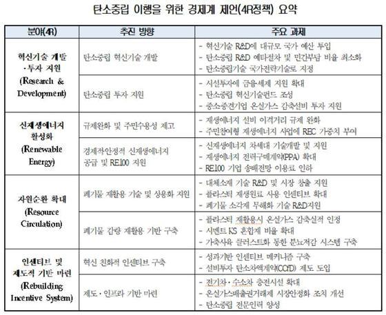 산업계가 제안한 ‘4R 정책’은 △혁신기술 개발·투자 지원(R&D) △신재생에너지 활성화(Renewable Energy) △자원순환 확대(Resource Circulation) △인센티브·제도적 기반 마련(Rebuilding Incentive System) 등이다.