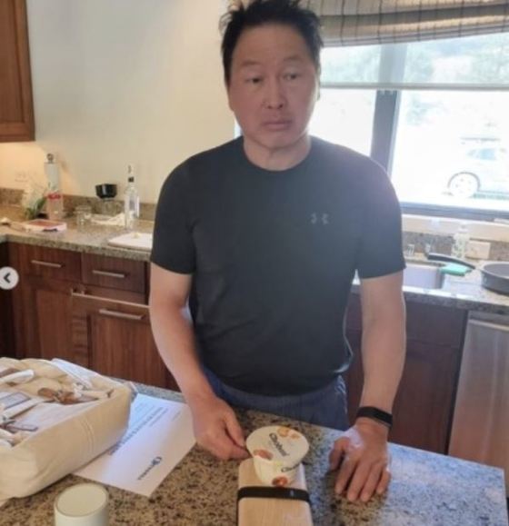 지난달 31일 최 회장은 자신의 인스타그램에 미국 출장 중 부엌에서 요거트를 앞에 두고 부스스한 머리를 한 채 멍한 표정으로 서 있는 사진을 공개했다.