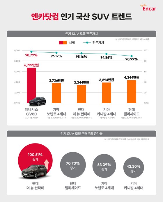 8일 엔카닷컴에 따르면 추석 연휴를 앞둔 시기는 SUV에 대한 소비자 관심도 함께 증가하는 경향이 있다. 인기 차종인 SUV는 거래가 더 빨리 이뤄져 시세와 잔존가치에 영향을 미치기도 한다.