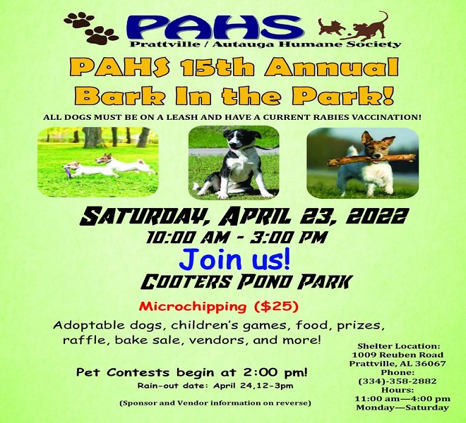 오타우가(Autauga) 카운티에서는 제15회 프랫빌 오카우가 휴먼 소사이어티의 “바크 인 더 파크”(Bark in the Park) 행사가 토요일(23일) 오전 10시부터 오후 3시까지 쿠터스 포노 공원(Cooters Pono Park)에서 열린다.