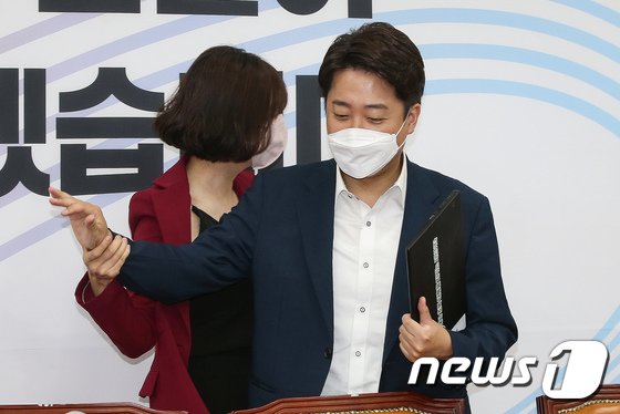 국민의힘 이준석 대표와 배현진 최고위원이 지난해 11월4일 국회에서 열린 최고위원회의에서 대화를 하고 있다. 2021.11.4/뉴스1 © News1 이동해 기자