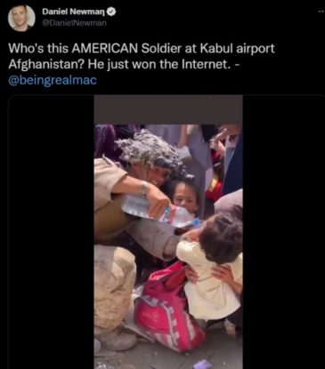 뉴먼이 공개한 영상 속 군인은 미소를 지으며 물병을 들고 카불 공항 바깥 길거리에서 부모의 품에 안겨 있는 어린아이들에게 직접 물을 먹이고 있다.