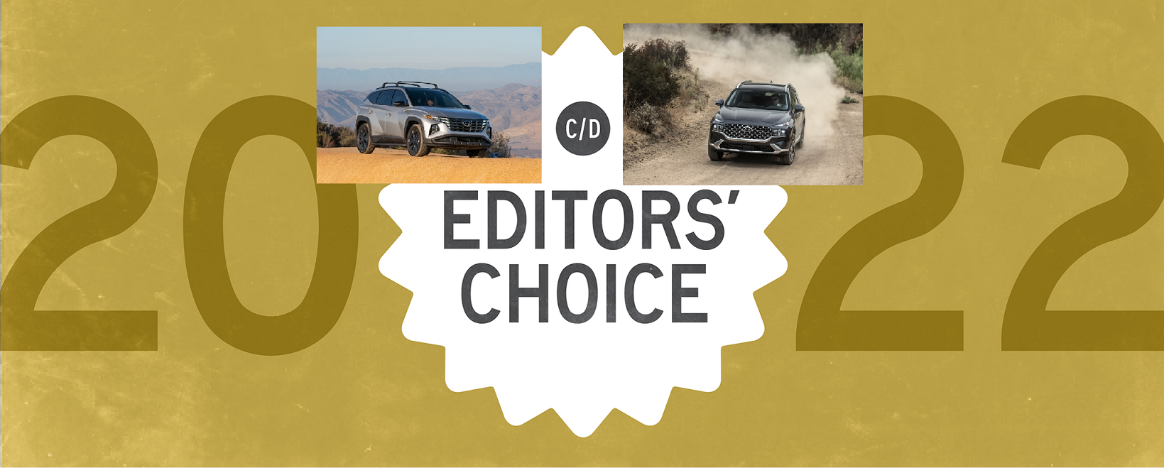 2022년에 ‘에디터스 초이스 어워드’를 수상한 현대차 모델은 엑센트, 엘란트라 N, 아이오닉 5, 코나, 코나 EV, 팰리세이드, 싼타 크루즈, 싼타페, 쏘나타, 투싼, 벨로스터 N 등이다.