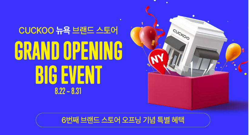 대한민국 대표 종합 가전 브랜드 쿠쿠가 오는 8/22 오후 3시  **쿠쿠 브랜드스토어 6호점**을 뉴욕에 오픈한다. 이번 오픈을 기념해 쿠쿠는 미국 전역 브랜드 매장에서 동시에 그랜드 오프닝 BIG EVENT를 진행하며 고객들에게 다양한 혜택을 제공한다.
