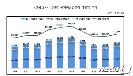 원자력산업의 매출도 4년 새 급감했다. 최근 10년래 매출 규모가 가장 컸던 2016년 27조4513억원에 비해 2020년엔 18.9% 줄어든 22조2436억원에 그쳤다.