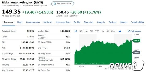 리비안은 15일(현지시간) 뉴욕증시에서 전거래일보다 14.93% 폭등한 149.35달러로 마감했다. 이로써 리비안의 시총은 1450억 달러가 됐다.