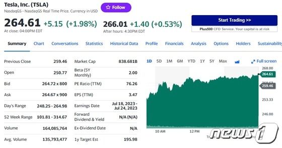 22일 뉴욕증시에서 테슬라는 전거래일보다 1.98% 상승한 264.61 달러를 기록했다.