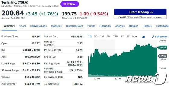 지난달 31일(현지시간) 뉴욕증시에서 테슬라는 전거래일보다 1.76% 상승한 200.84 달러를 기록했다. 이로써 테슬라는 하루 만에 다시 200달러 선을 회복했다.