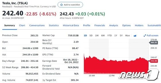 3일(현지시간) 뉴욕증시에서 테슬라의 주가는 전거래일보다 8.61% 폭락한 242.40 달러를 기록했다.