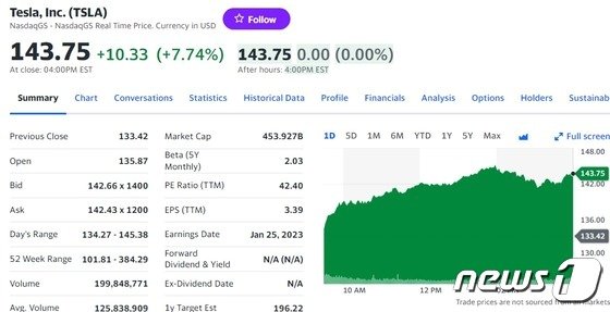 이에 따라 미국의 대표적 기술주인 전기차도 일제히 폭등한 것으로 보인다. 테슬라는 전거래일보다 7.74% 폭등한 143.75 달러를 기록했다.