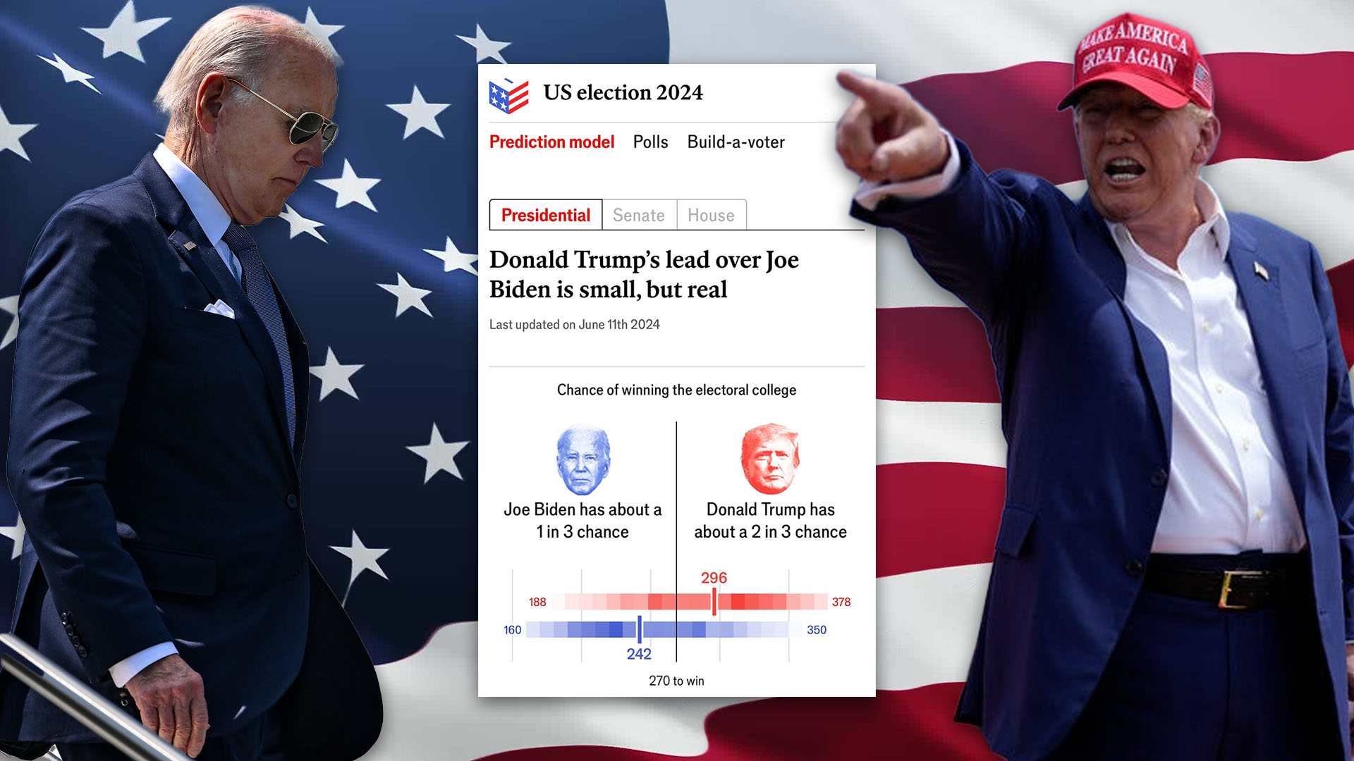 전체 대통령 선거인단은 538명으로, 이 중 ‘매직 넘버’로 불리는 과반(270명) 이상을 확보하는 후보가 승리하게 된다. 이코노미스트 조사에서 트럼프 전 대통령이 확보한 선거인단 수는 296명, 바이든 대통령은 242명이었다.