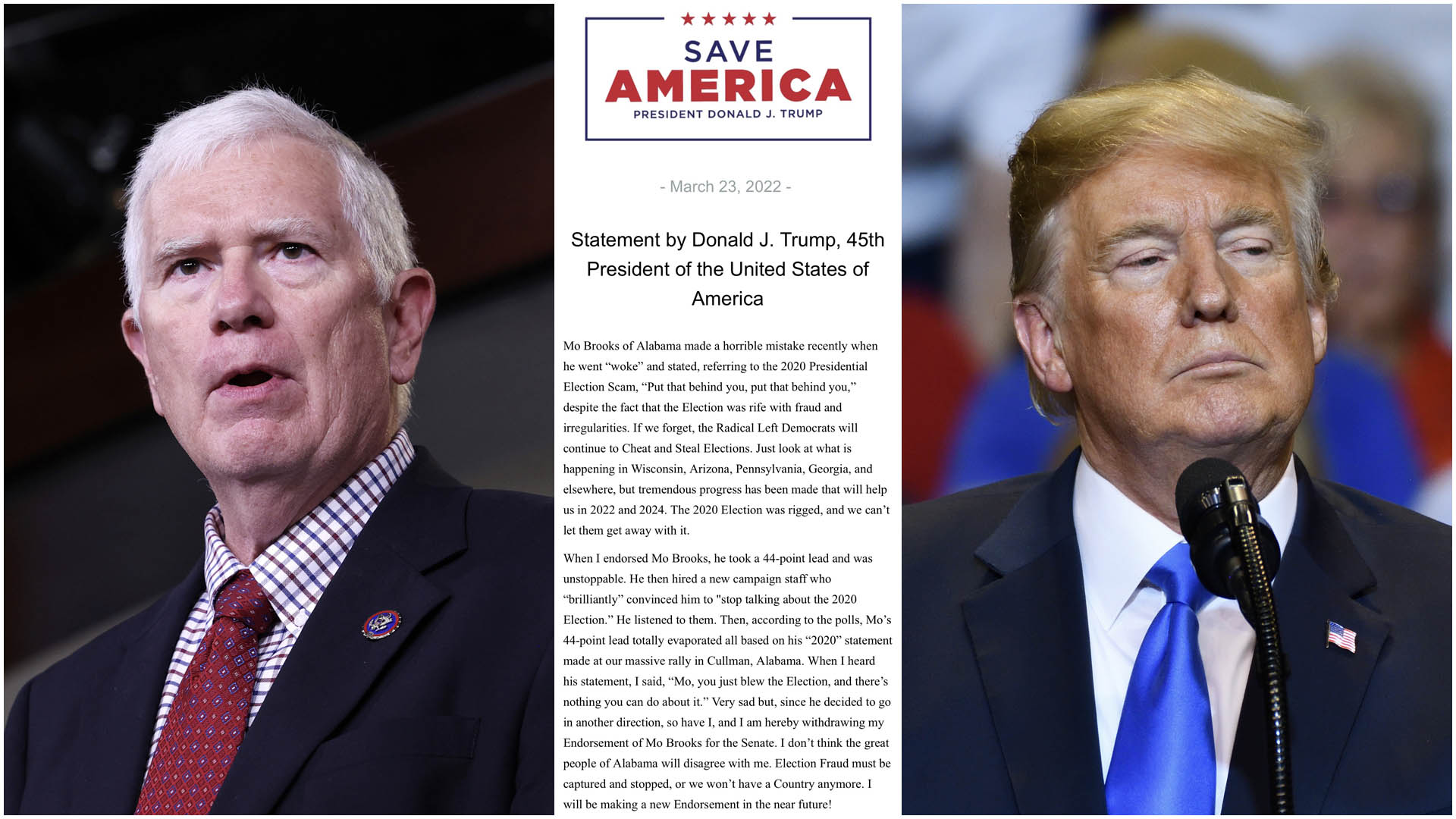 도널드 트럼프 전 대통령은 오늘(23일) 성명을 내고 앨라배마 연방상원 선거에 출마한 모 브룩스(Mo Brooks,공화·앨라배마) 하원의원에 대한 지지를 철회했다. 올해 중간선거를 앞두고 트럼프가 자신의 지지선언을 철회하기는 이번이 처음이다.