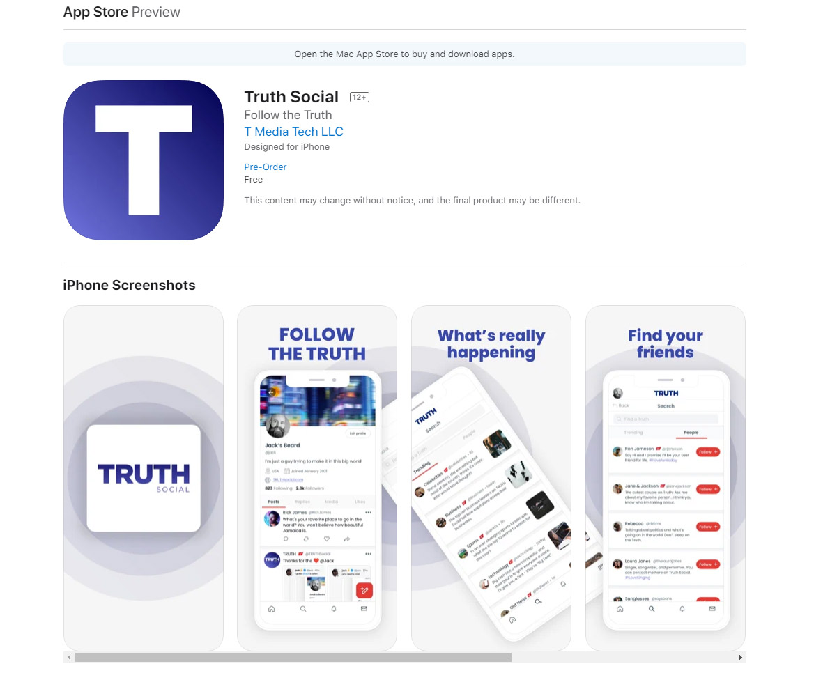 현재 트루스 소셜은 애플 앱스토어의 ‘미리보기’에 등록돼있는 상태다.