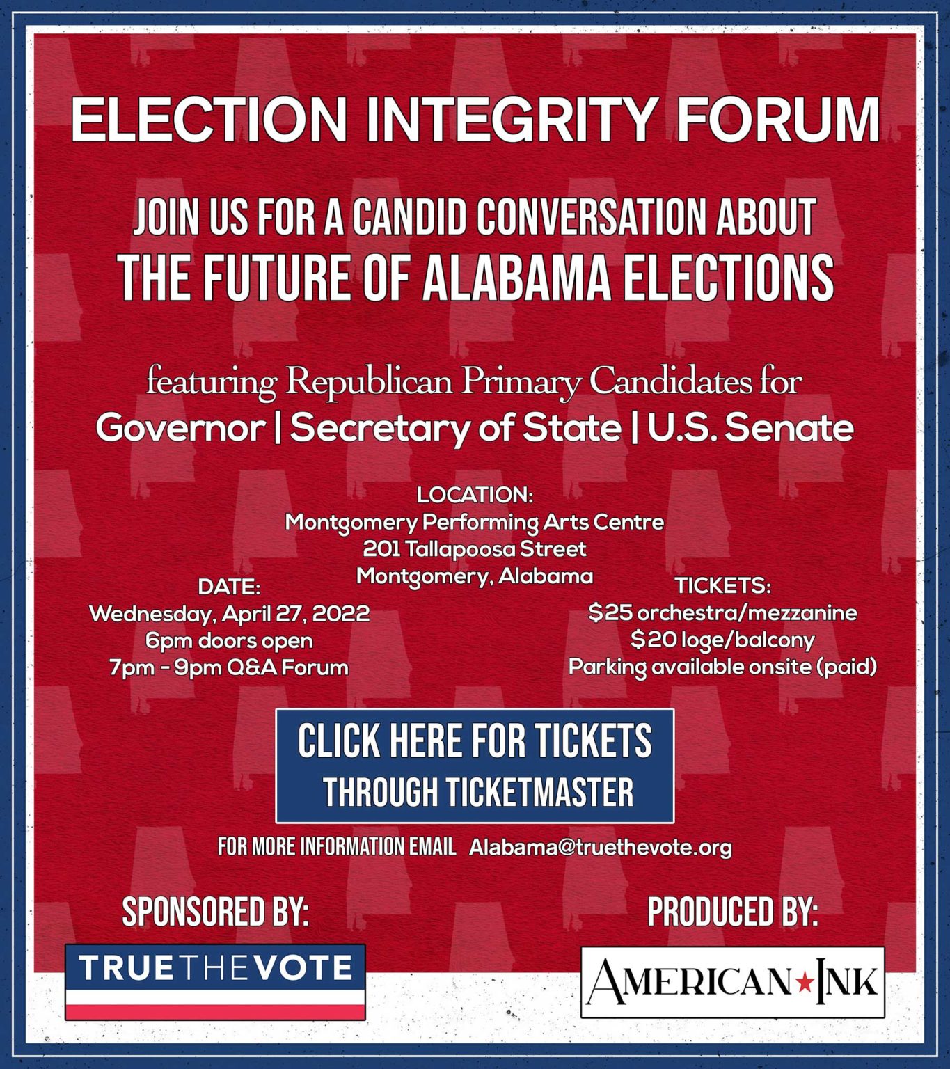 선거 청렴 감시단체 “트루더보트”(True The Vote)가 오는 4월 27일(수) 몽고메리에서 포럼을 개최한다. 행사는 오후 7시부터 9시까지 몽고메리 퍼포밍아츠센터에서 열리며, 오후 6시부터 입장할 수 있다.