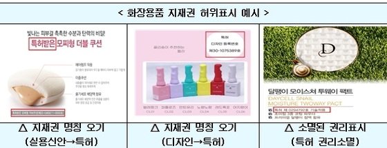 특허청이 화장품 지식재산권 허위표시 집중단속을 한 결과 31개 제품에서 672건의 허위표시를 적발했다.