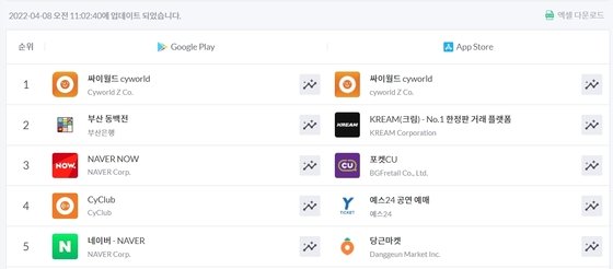 모바일 순위 분석 사이트 게볼루션에 따르면 8일 오전 기준, 싸이월드는 구글 플레이·애플 앱스토어에서 다운로드 수 1위를 기록하고 있다.