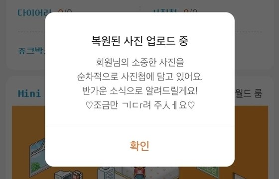 사진첩 복구가 완료되면 싸이월드 앱을 통해 “○○○님 추억을 사진첩에 담았습니다”는 알람이 전송된다. 복구된 사진첩은 Δ다이어리 Δ사진첩 Δ게시판 Δ동영상으로 구성돼 있다.