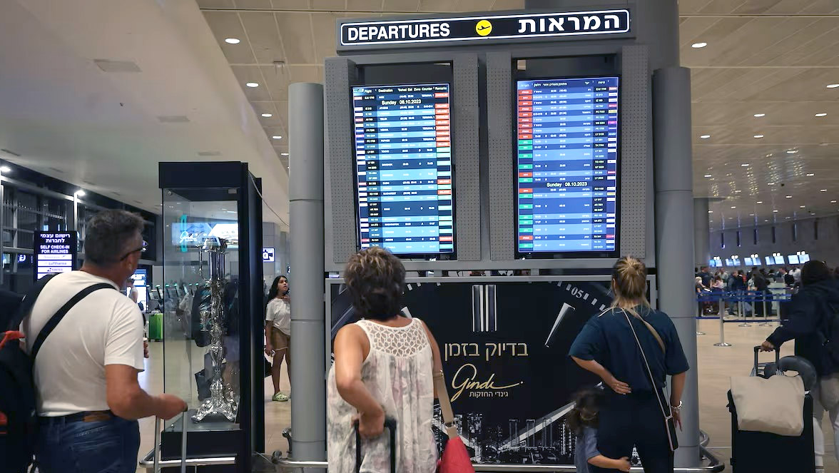 9일(현지시간) 이스라엘 텔아비브의 벤 구리온 국제 공항에서 승객들이 항공편 게시판을 바라보고 있다. 이날 이스라엘에서는 하마스의 대규모 공격을 받아 비행편이 잇따라 취소되거나 축소됐다. 2023.10.09