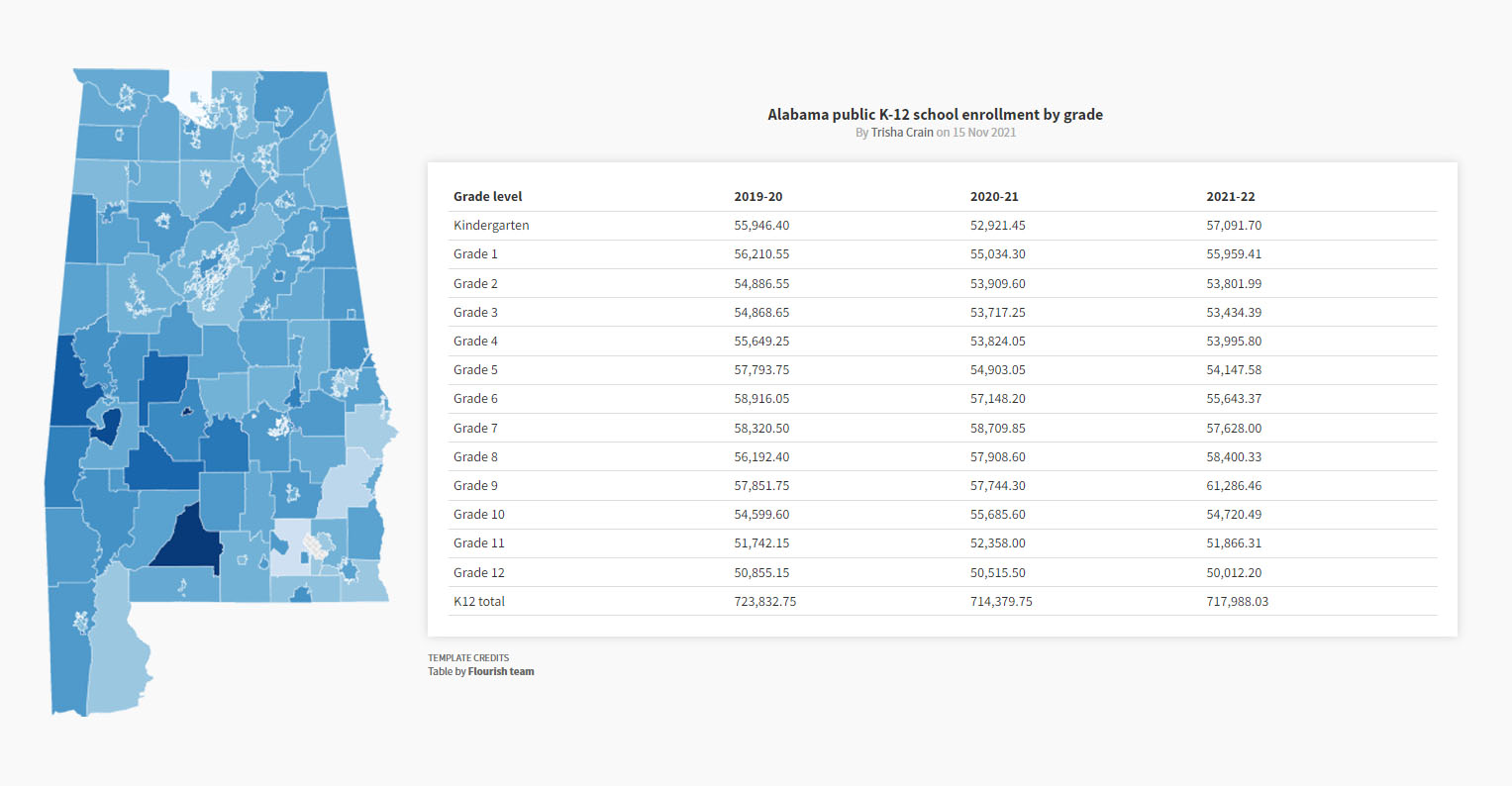 버밍엄과 몽고메리를 포함한 2020-21년 상당 기간 동안 온라인으로 운영됐던 많은 학군들은 등록자가 감소했지만, 이들 또한 오랫동안 학생들을 잃고 있는 학군이다.