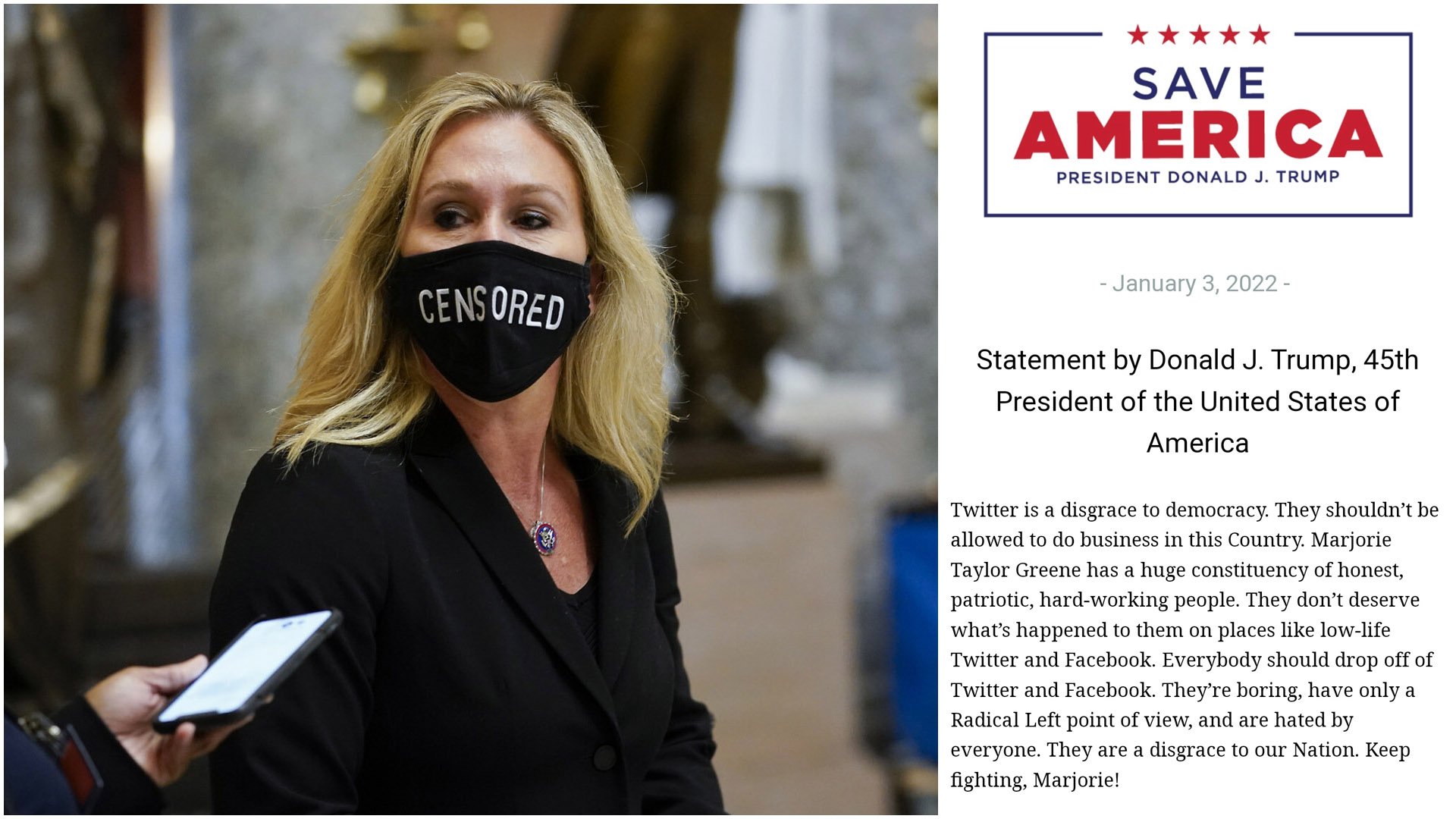 그린 의원은 “이것은 언론의 검열을 넘어서는 것”이라며 “나는 70만 명이 넘는 세금을 내는 미국 시민들을 대표해 선출된 연방하원의원이며, 나는 그들의 목소리, 가치, 자유를 수호하고 헌법을 수호한다”고 말했다.
