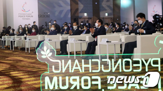 | 정세균 국무총리, 강금실 2021평창평화포럼 공동위원장, 최문순 강원도지사 등이 7일 강원도 평창군 알펜시아 컨벤션센터에서 열린 2021평창평화포럼 개회식에서 소개 영상을 보고 있다. 2021.2.7/뉴스1 © News1 김명섭 기자 |