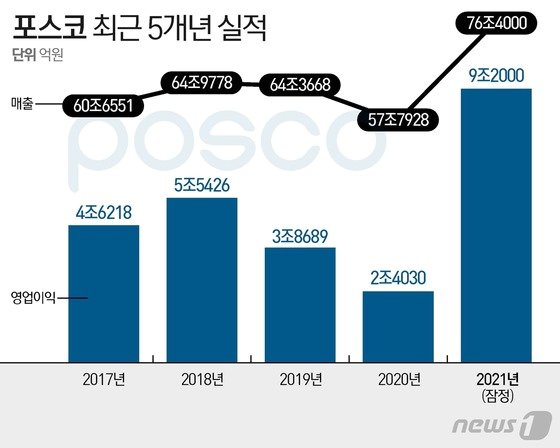 실제로 지난해 포스코의 별도기준 매출은 39조9000억원, 영업이익은 6조6000억원을 기록했다. 매출과 영업이익은 전년 대비 각각 50.6%, 48.6% 증가했다.